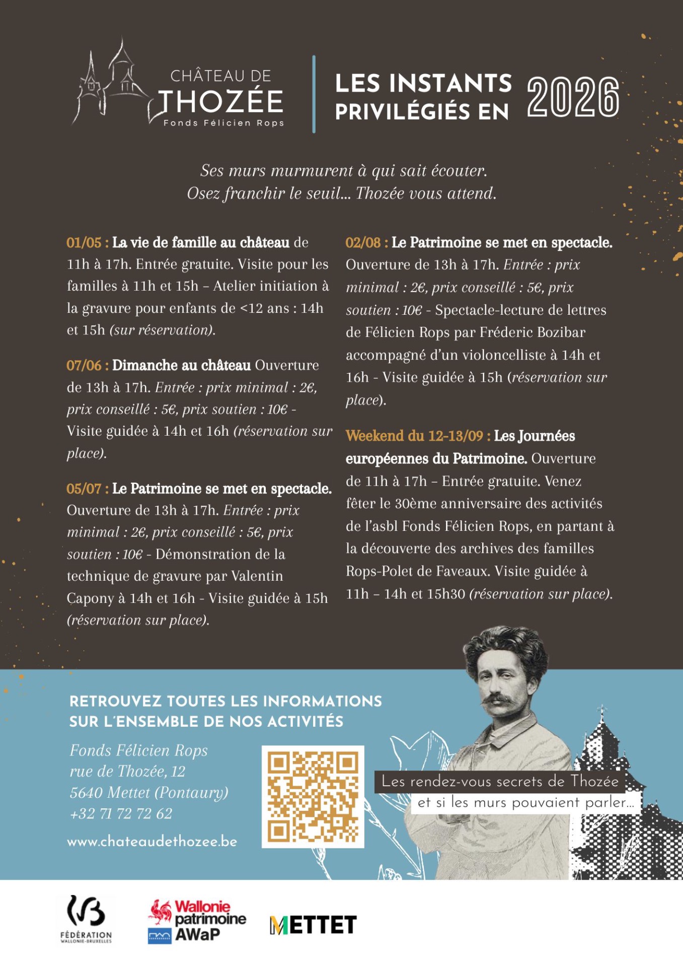 Cette année, en de rares occasions, les portes du Château s'ouvrent au public. Laissez-vous emporter par l'histoire de Félicien Rops et de sa famille, l'atmosphère unique du lieu et des anecdotes qui l'habitent.